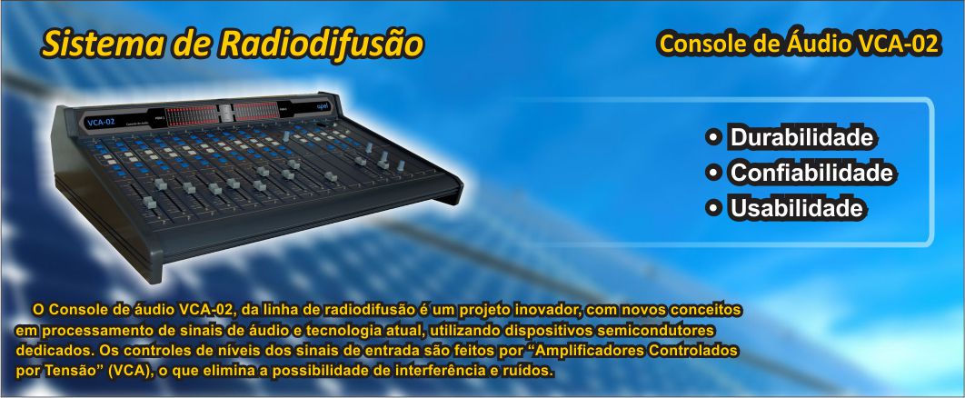 Características: - 20 entradas em 10 canais (modulares); - Entradas independentes (20); - Controle digital - Atenuadores Indiretos de 100 mm - Compressor/limitador - Dois programas e Pré-Audição (CUE) - Saídas para gravação - Saídas para fones - Microfone para intercomunicação - Retorno para transmissões externas - Chaves comutadoras programadas por ..microcontroladores - Pré-Amplificadores de baixo ruído (AD) - Phantom Power - Medidor digital por projeção - Controladores de ganho Analog Device